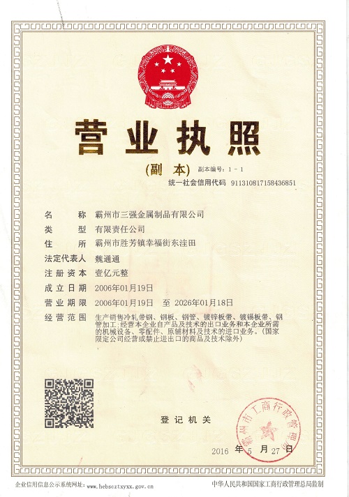河北霸州市三強(qiáng)金屬制品有限公司坐落于歷史文化名鎮(zhèn)-------勝芳鎮(zhèn),是一家集中寬帶光亮帶鋼、熱鍍鋅帶鋼、精密制管、優(yōu)質(zhì)鋼等產(chǎn)品開(kāi)發(fā)、生產(chǎn)、銷售于一體的鋼鐵聯(lián)合企業(yè)。公司創(chuàng)建于2006年,占地面積142300平方米,注冊(cè)資金1億元,現(xiàn)有員工600多人,年產(chǎn)1000mm以下冷軋薄帶100萬(wàn)噸。產(chǎn)品廣泛應(yīng)用于汽車、家電、建筑、橋梁、電子等行業(yè)。產(chǎn)品規(guī)格全、質(zhì)量好、售后有保障。是廣大終端用戶、鋼貿(mào)商理想的可持續(xù)合作伙伴。