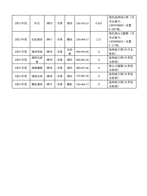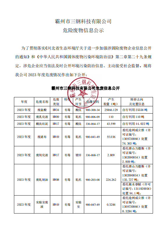 霸州市三鋼科技有限公司 危險廢物信息公示