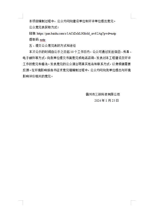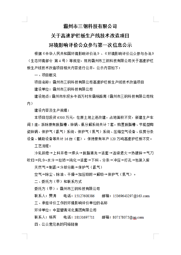 霸州市三鋼科技有限公司 關(guān)于高速護(hù)欄板生產(chǎn)線技術(shù)改造項目 環(huán)境影響評價公眾參與第一次信息公示